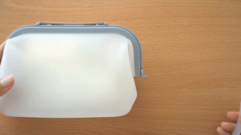 To store Lasty food pack, first press the left and the right of the silicone body to squeeze the air out. Second, divide the silicone body into thirds and fold it twice.