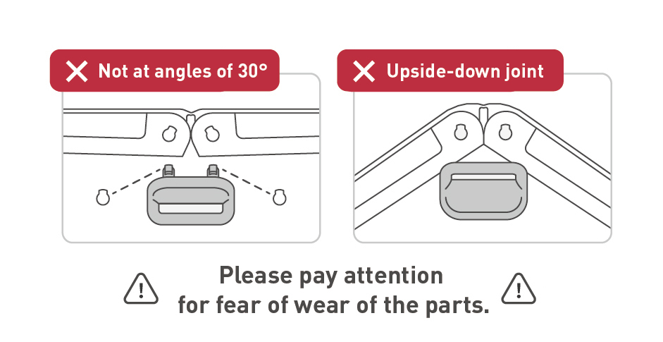 When you are going to assemble the joint, make sure that the protrusions on the joint fit into the holes on both frames, so that you can successfully assemble the joint. During your assembly, if the angle is not like what is shown below, it may cause the wear of the parts. Please pay attention.