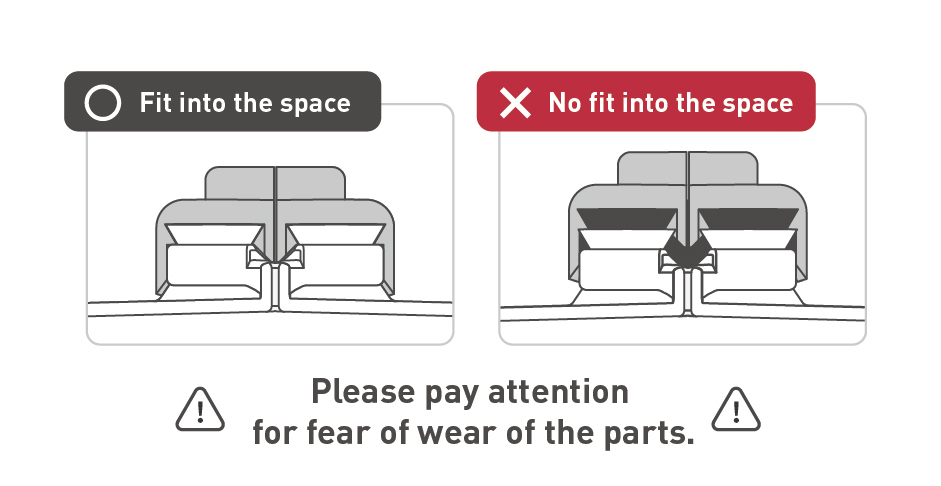 After you disassemble the joints on both sides, you can easily disassemble the pack frames. When you need to assemble the pack frames, slide the pack frames along the groove and make it fit into place. After the assembly, make sure your Lasty food pack fit into the place like the left picture below before you start the assembly of joint. (If it looks like the right picture below, it needs to be reassembled.)
